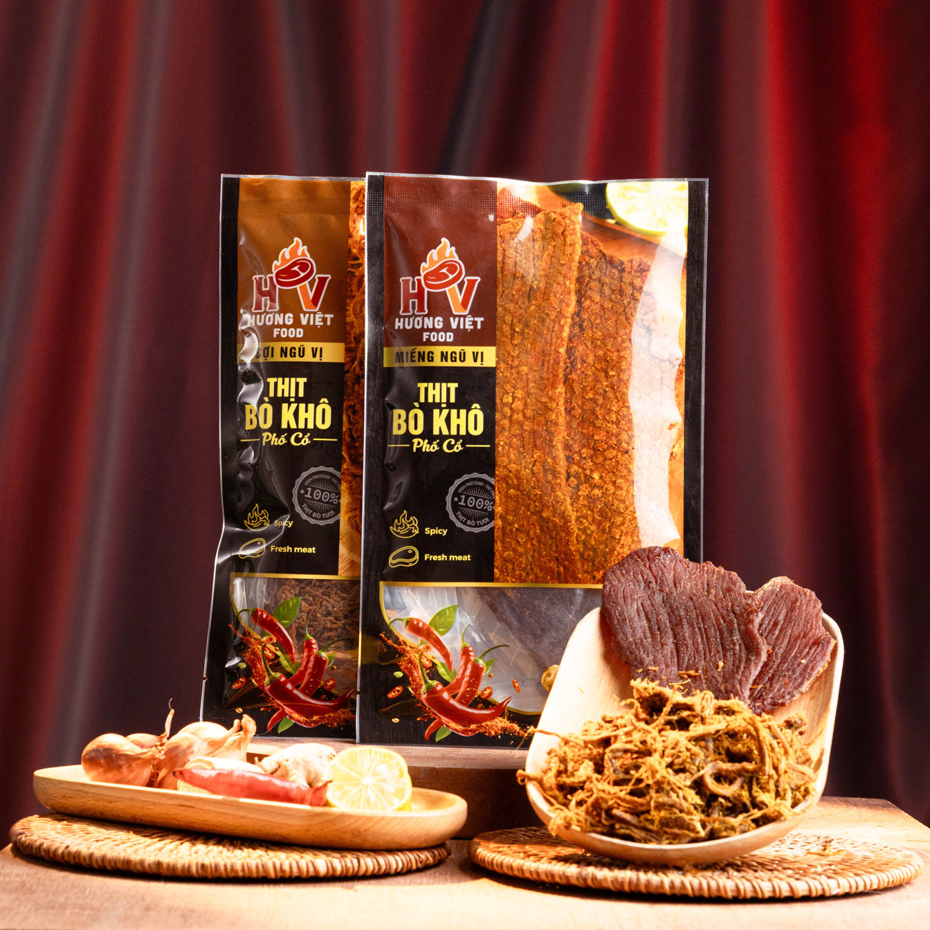Hương Việt Food cam kết chỉ dùng 100% Thịt Bò Úc tươi, có nguồn gốc (CO, CQ) minh bạch. Thịt được sơ chế kỹ lưỡng, lọc gân, mỡ thừa và rửa sát trùng bằng nước muối trước khi thái. Đặc biệt, bò miếng được thái bằng Máy Thái Lát công suất cao để đạt độ dày đều. Công đoạn tẩm ướp diễn ra trong Máy Massa Chân Không Inox 304 (3 trong 1), giúp gia vị Ngũ Vị Hương cùng gừng, sả, hành, tỏi tươi thấm sâu tuyệt đối, tránh nhiễm khuẩn. Sau đó, thịt được rim chín ở nhiệt độ C để diệt khuẩn. Sản phẩm được sấy khô bằng Lò Sấy Đối Lưu Inox 304, đảm bảo chất lượng Miếng dai dẻo và Sợi mềm dai vệ sinh tối đa.